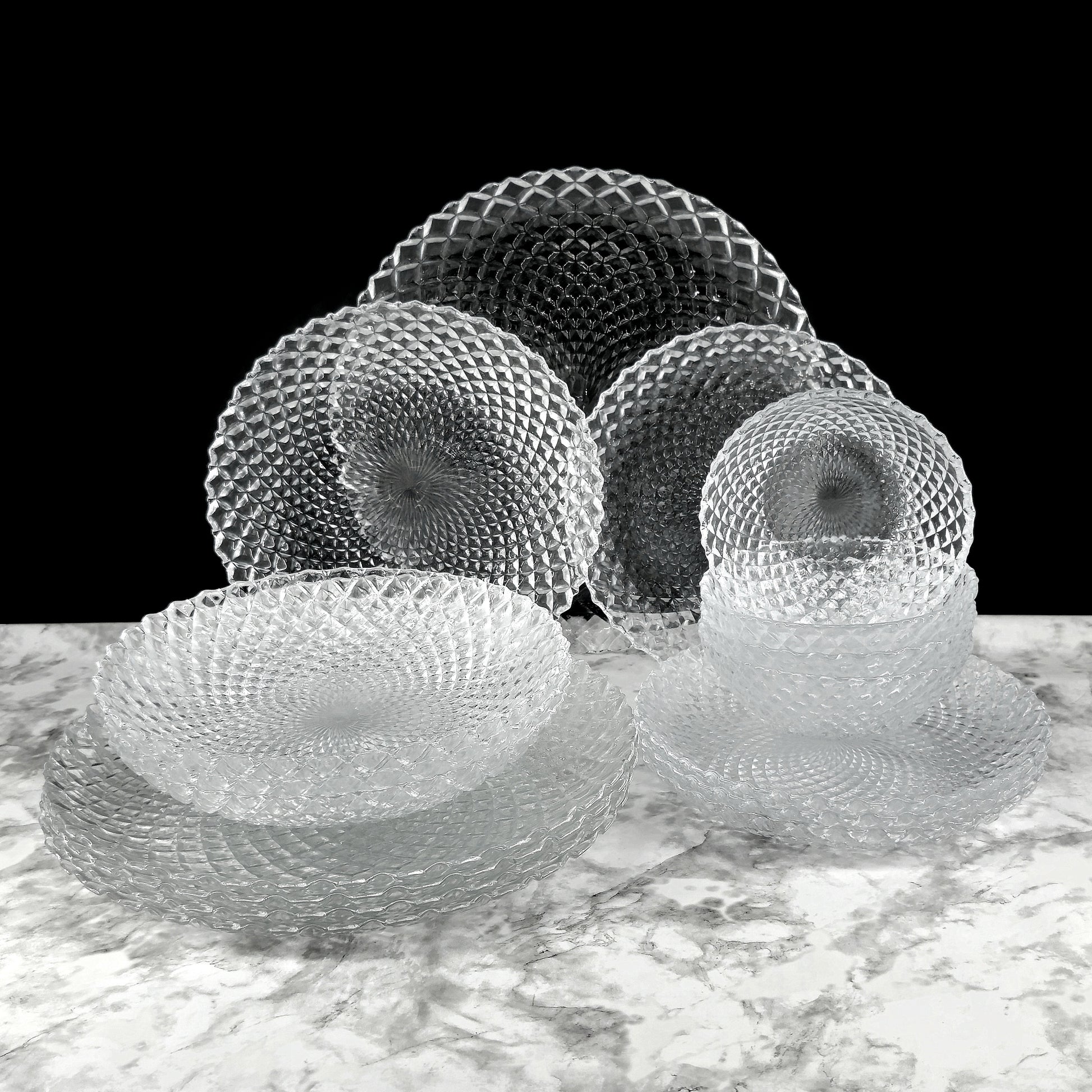 PAVO dinnerware set is a stunning work of functional art that will transform your dining experience. The rich, sparkling details and diamond motif create a mesmerizing visual that will impress your guests. Crafted with care, PAVO is both beautiful and highly practical, making it a must-have for any home. Whether you're hosting a dinner party or simply enjoying a quiet meal, this versatile set will impress your guests and make your food look as good as it tastes.